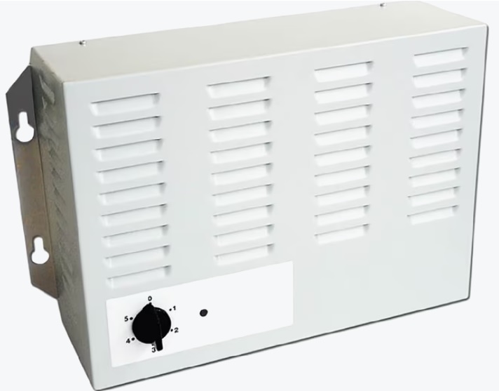Трехфазный регулятор, который управляет скоростью вентиляторов, изменяя подаваемое напряжение. Допускается управление несколькими двигателями вентиляторов, если общий потребляемый ими ток не превышает номинального тока регулятора. Скорость переключается вручную рукояткой на корпусе. Имеется встроенное защитное устройство электродвигателя, которое прекращает подачу напряжения к вентилятору, если активируются термоконтакты ТК электродвигателя. Защитное устройство перезапускается после охлаждения двигателя путем установки рукоятки на 0 на 10 секунд, после чего можно возобновить работу.
